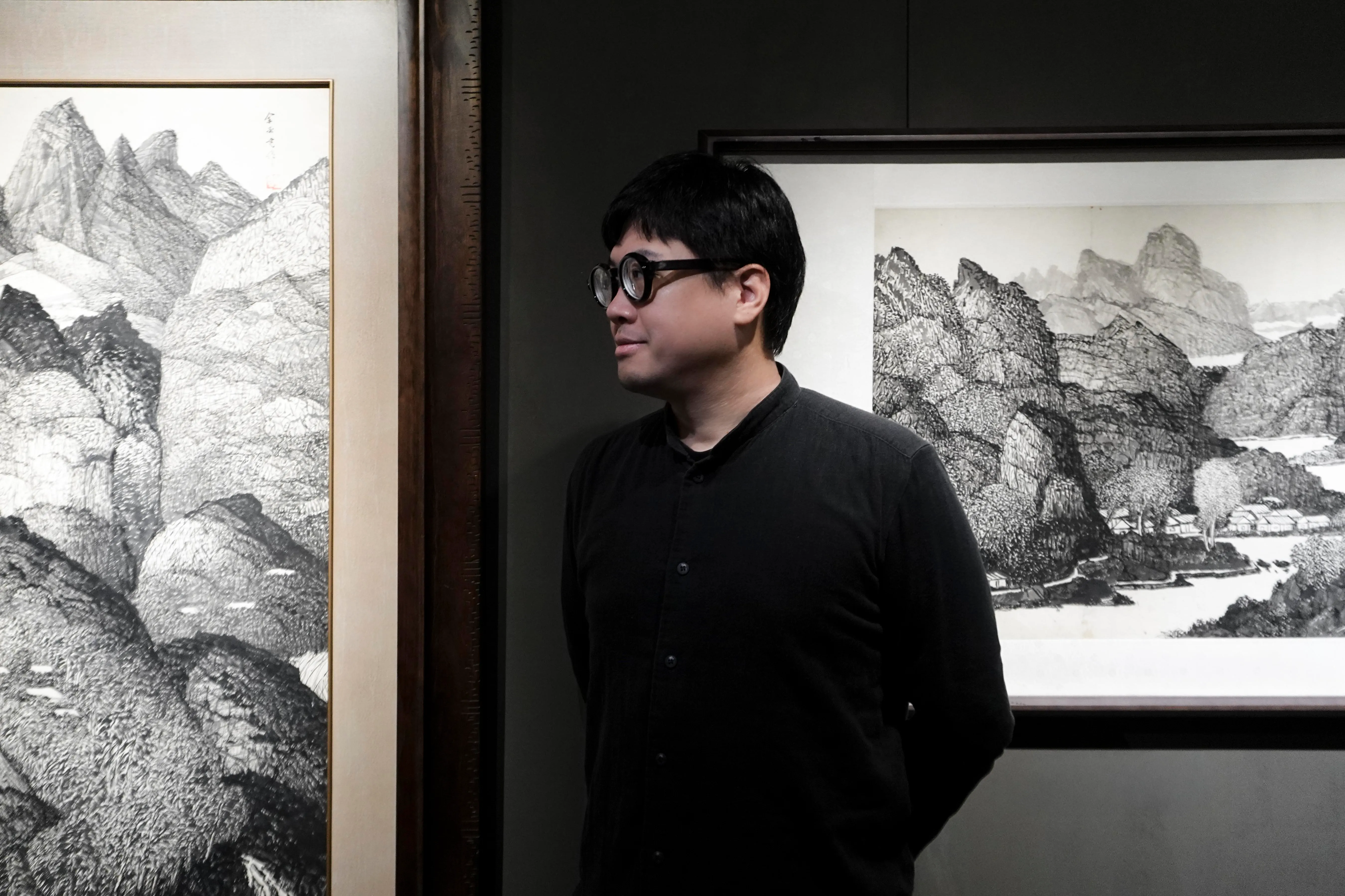 在2013至2017年期間,楊新收於中國藝術研究院就讀時,初期主要以潑墨的方式進行創作,他在宣紙或細絹上大面積的讓墨、色料與水自然交融。隨後,他以細筆勾勒和渲染,待墨色乾透後再用水注沖洗,並保留絹布內裡的墨痕,使交疊的漬痕自然形成峰巒起伏的山稜線。其中虛實模糊的空間,似雲非雲,似山非山,令人難以界定何謂天、何謂地?有別於郭熙(約1000年—1087年後)力求的「可行,可望,可遊,可居」之山水,在楊新收的山水世界裡,或許觀者無須步足於內,僅透過「臥遊」、「神遊」的方式便能意會其中妙趣,並透過線條的邊界來辨識畫面的圖(前景)、地(後景)分區,使整體產生一種夢幻而帶有空氣感的奇異效果。同時,我們不難看出其扎實的繪畫功底,以及對光影細微變化的敏銳捕捉,體現了他對水墨技法和陰陽哲學的創新探索。而近期延續此脈絡所創作的〈探幽集〉(2023),即試圖追求埋藏在內心深處的「枯寂性」,藉著一種實驗性的、抽離現實的心理狀態,與大時代下人類所共同面臨的課題相呼應。這種視覺感如同將相機光圈轉小,搭配高速快門所捕捉到的幽微光景一般,自然萌生出一種深沉且內斂的情感,隨著層次多變的筆墨變化,於畫面上被緩緩釋放出來。