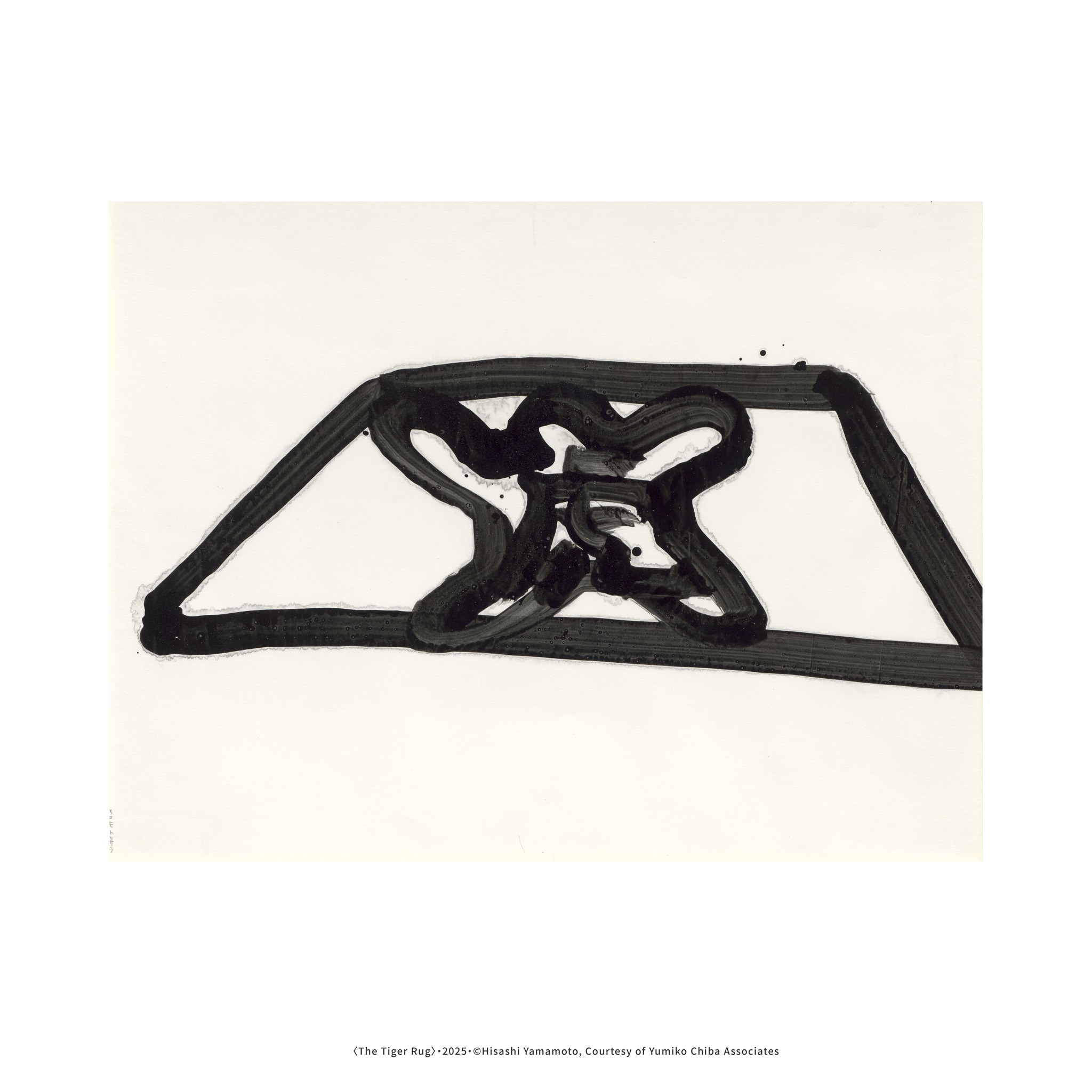 私が⼦供の頃、親戚の家には⻁の敷物が敷いてあった。⻁の⽪を剥いだシート状のものだ。私はそれを⾒るたびに、ぎょっとなっていたことを今でも思い出す。⼈間はその歴史の中で、狩り、征服し、⾃然を⾃らの⼒と快楽の道具へと変えてきた。その象徴的存在が⻁の敷物だったのである。かつて猛々しく⽣きていた⻁は、⾜元に敷かれ、我々の虚栄のマスコット的存在になっていたのだ。この作品に描かれているのは、我々⼈間の⽂明の⽭盾である。私たちは野⽣そのものを、⾃らの満⾜のために作り変えてしまった。けれども現代においては絶滅危惧種保護法の制定により、その利⽤は厳格に制限され、過去の⾏為を省みる時に差し掛かっている。「The Tiger Rug」は、我々の歴史的⾏動を冷静に省察し、⾃然との共⽣を模索するための作品である。—— 山本 尚志 (Hisashi YAMAMOTO), 2025
